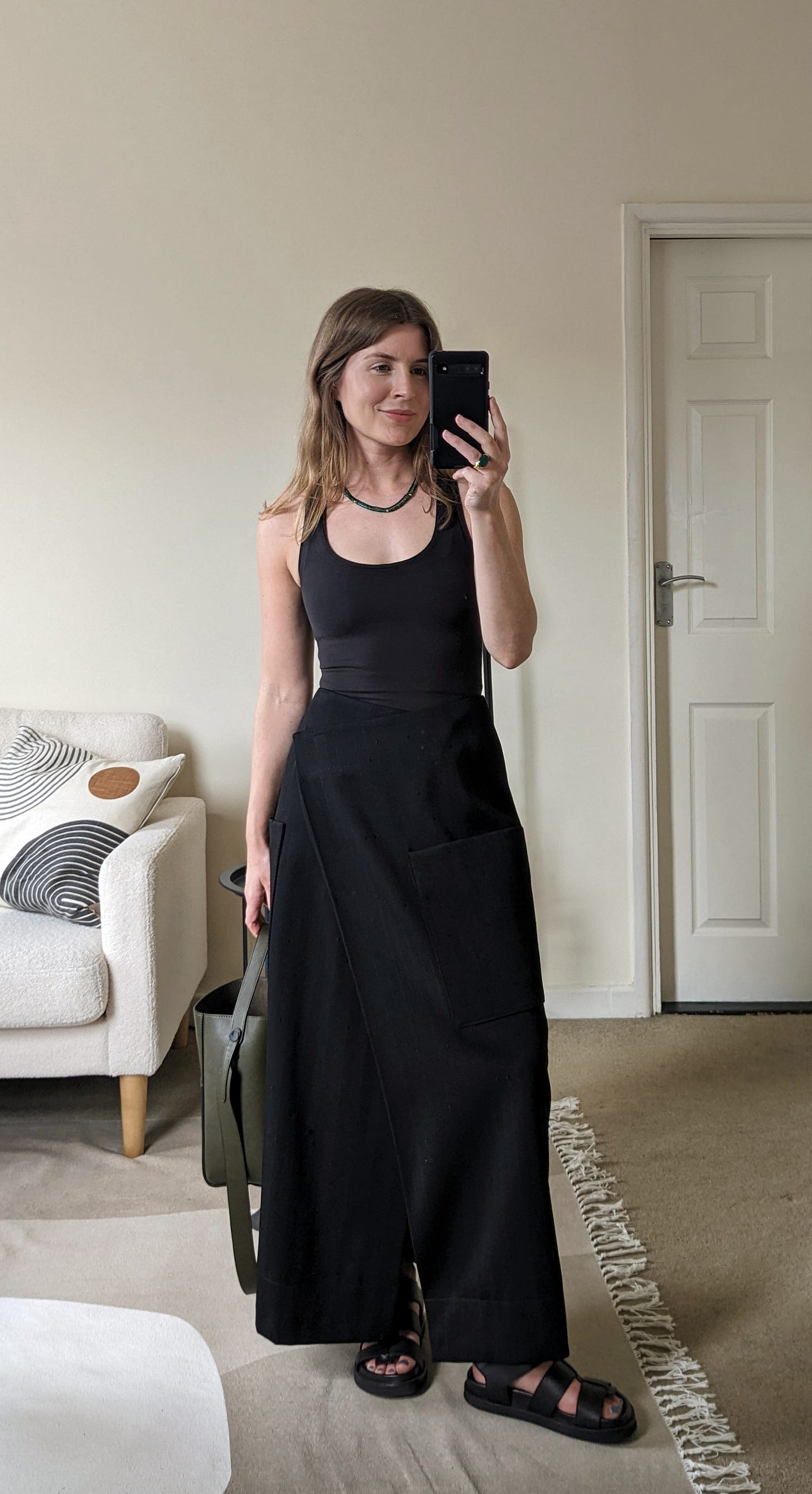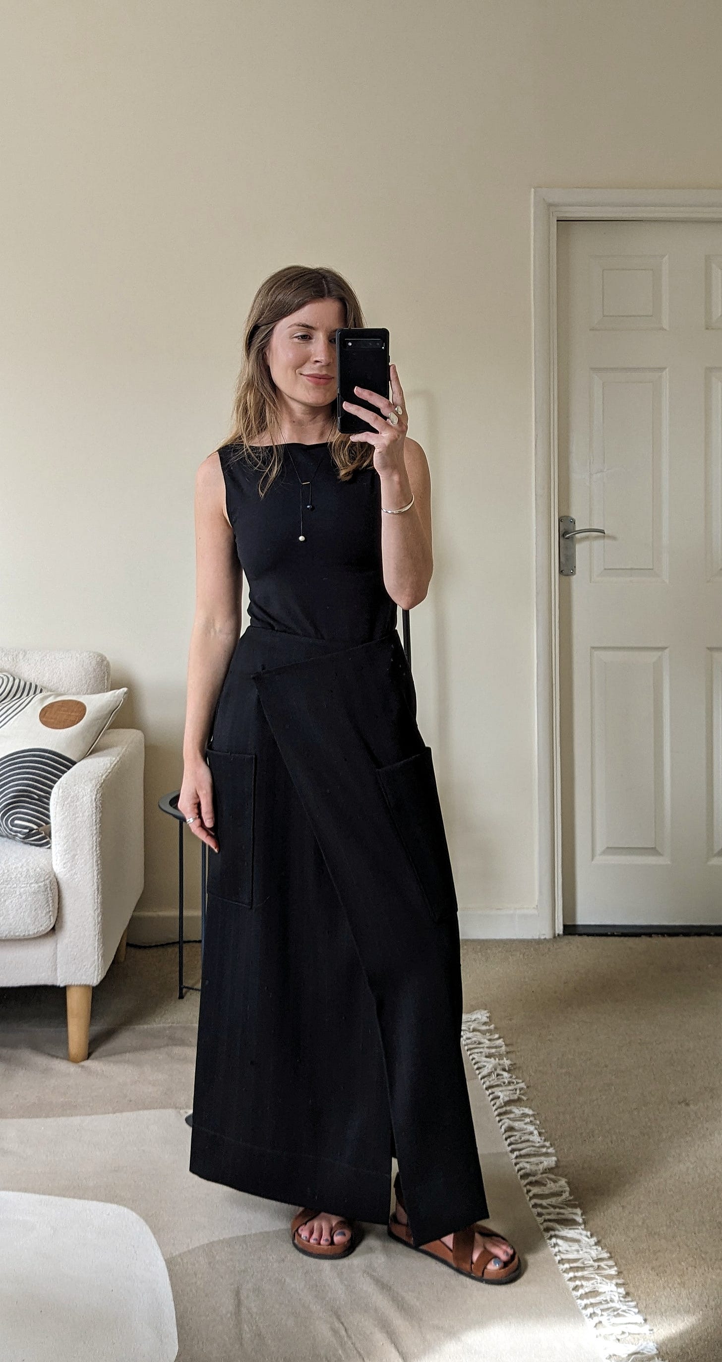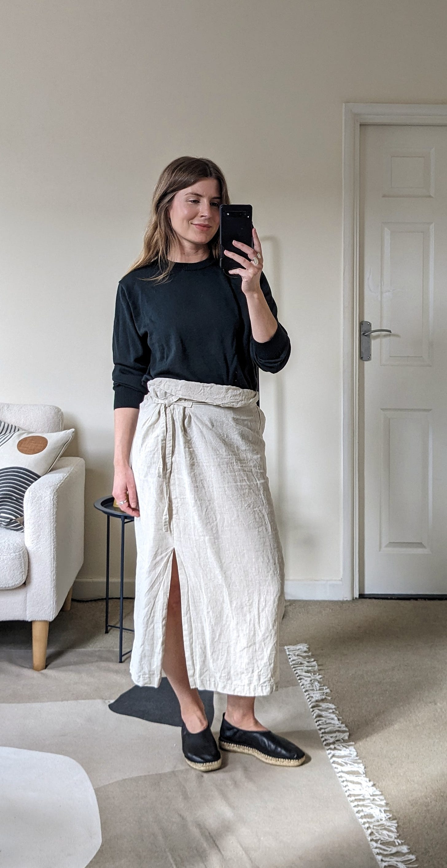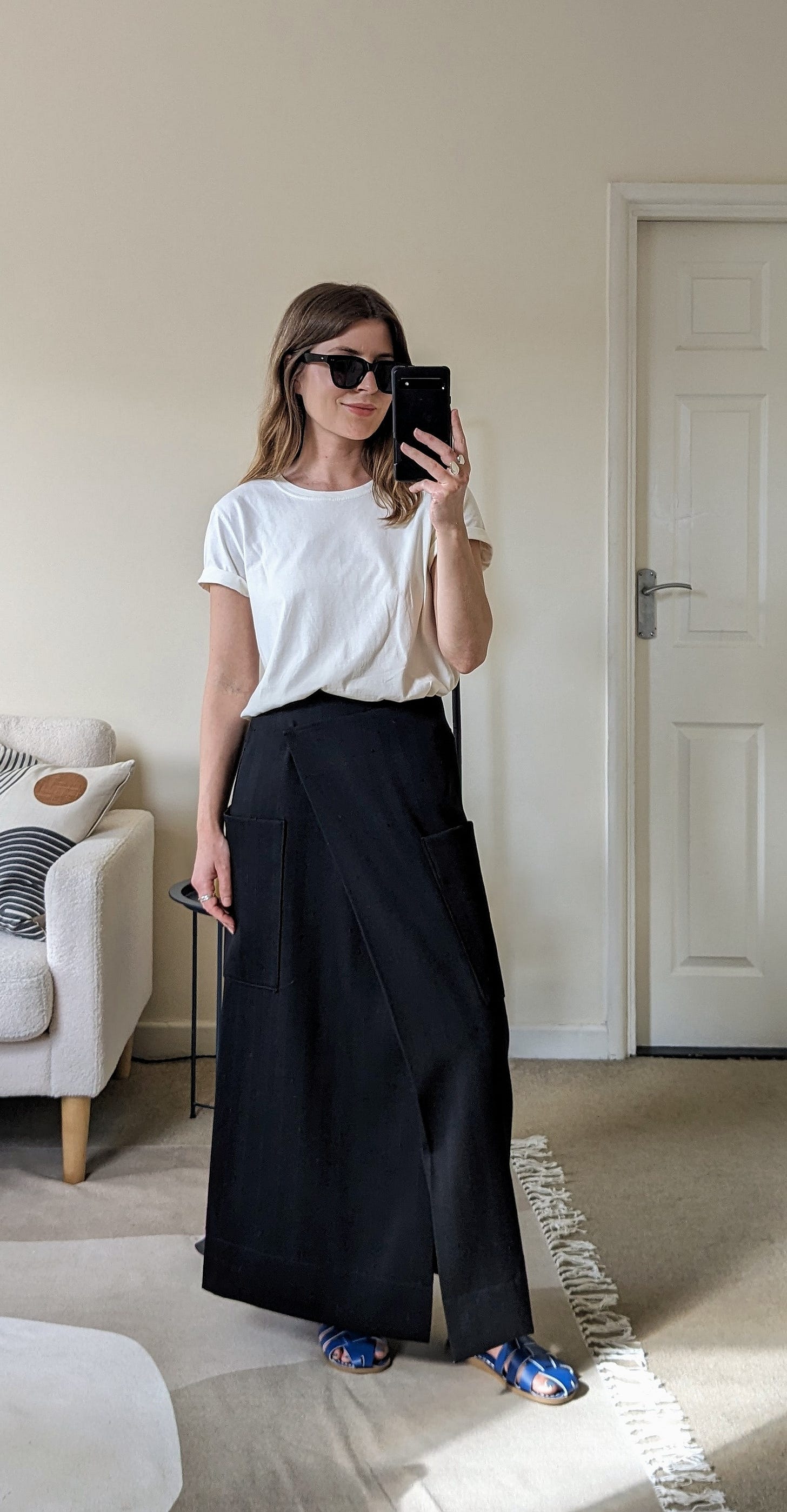 Now, along with that linen midi skirt, I have another skirt in my collection. Granted, this is still only two — nowhere near the number of trousers I own — but for an item that I don’t wear all the time, two feels apt. That second one is from Raey (which I sincerely hope survives Matches’ administration). It’s a similar shape — long and straight — with a wrap front. It differs in that it’s black and made from a wool-blend herringbone, so it’s got a bit more weight to it than my linen one. It’s also got big patch pockets on the sides, which makes an excellent design detail (although I wouldn’t want to put anything too bulky in there).