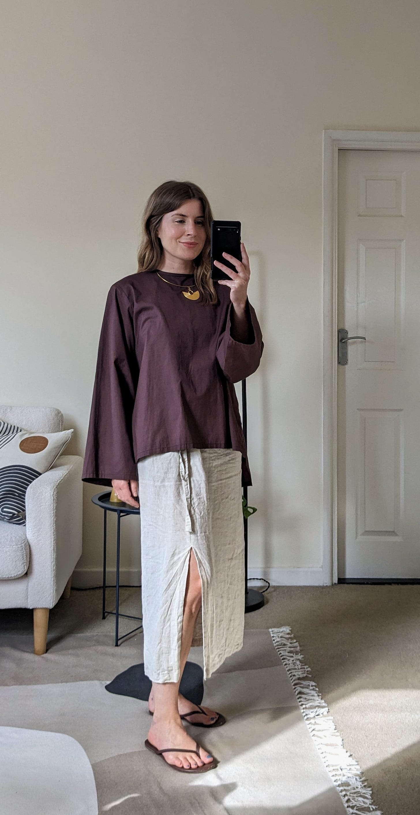 I wore this look a few times last summer. I wore a variation of it (with different jewellery) during a trip to the Loire in France and loved the blend of the boxy cotton top with the linen skirt so much, that it became my go-to outfit when I wanted to feel a little dressed up — but not too much. The top is a nice, rich shade of chocolate brown and has these incredible wide sleeves, so it was always feels as though it elevates anything else I pair it with.