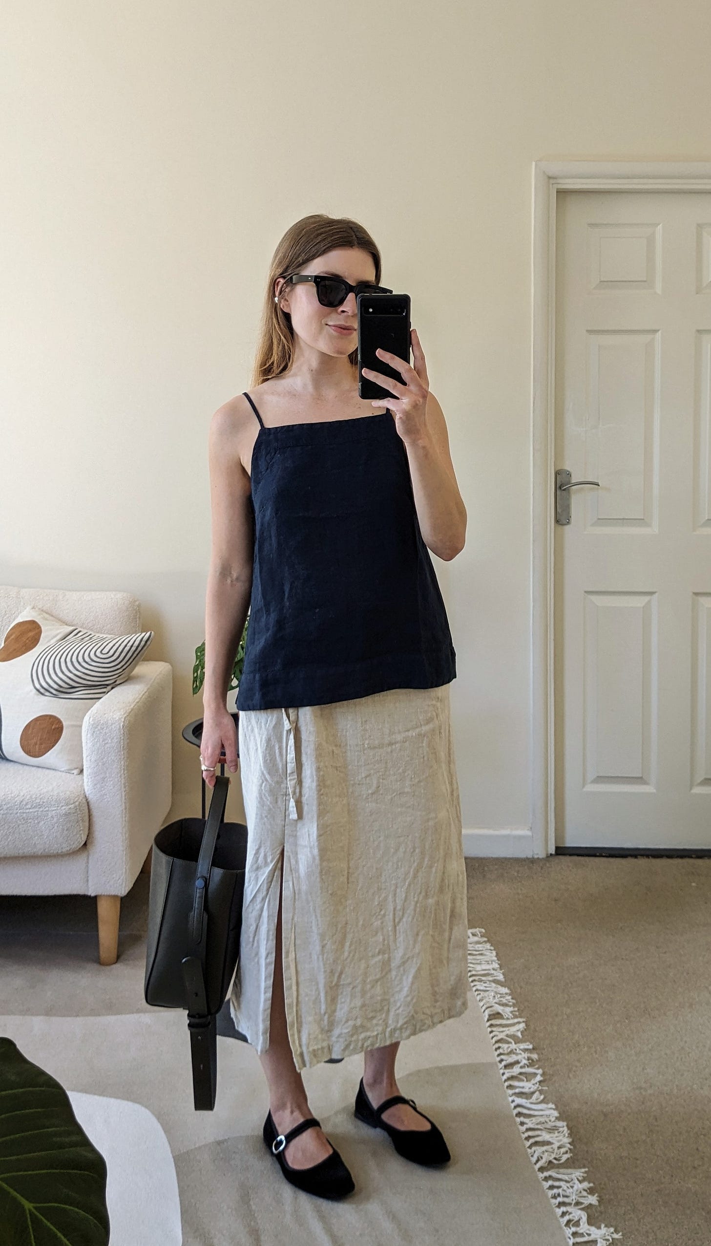 This outfit is definitely for the warmer days, when only a strappy top will do. The top is from Toast and is a lovely thick linen, which means I can get away with going braless (I’d recommend a sleeveless bra if you want more support, so you don’t clash with those thin straps). It’s a dark, inky navy, which goes well with the natural linen of the skirt.